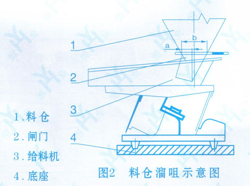 (3)料倉(cāng)開(kāi)口尺寸應(yīng)能保證獲得足夠的料層厚度。同時(shí)為了調(diào)節(jié)料層厚度應(yīng)設(shè)置閘門。料倉(cāng)配置型式參看圖2,一般情況下,a與b的比值為1/4左右。