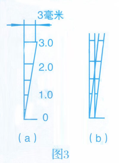 (1)振幅的測(cè)量振幅指示牌如圖3(a)所示,只是部分為一直角三角形。當(dāng)指示牌與槽體一起振動(dòng)是,由于視覺(jué)暫留,直角邊與斜邊形成一個(gè)交點(diǎn),其交點(diǎn)所對(duì)應(yīng)的標(biāo)尺數(shù)即為被測(cè)槽體的雙振幅。當(dāng)雙振幅為2毫米時(shí),交點(diǎn)就對(duì)應(yīng)在標(biāo)尺2處,如圖3 (b)所示。
